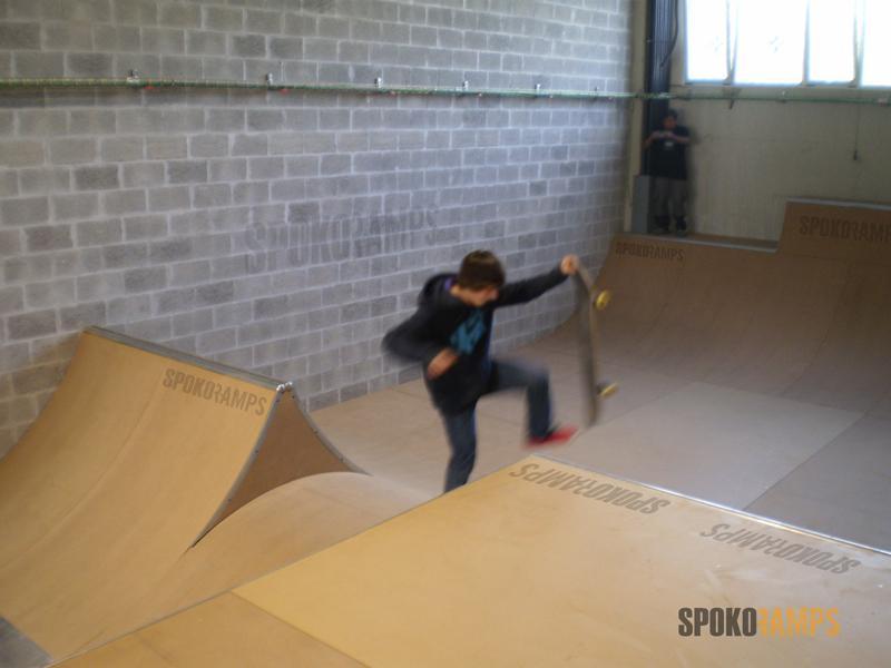 Skatepark indoor  privado construido en madera reforzado con protecciones metalicas en los bordes patinables.